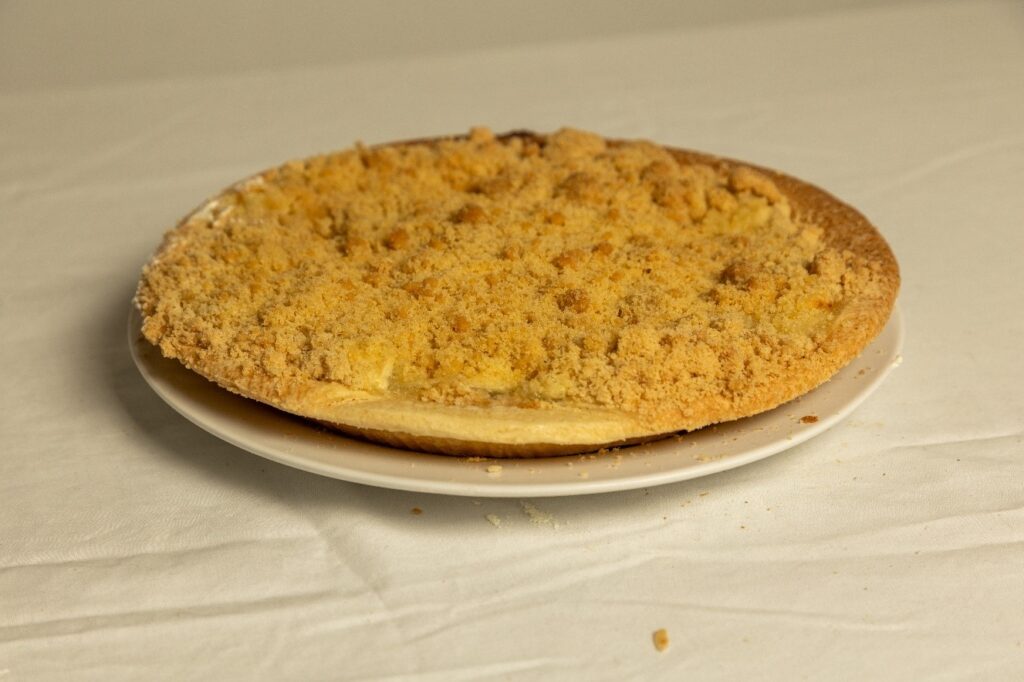 A homely, shortbread pastry base filled with High quality Bramley Apple and topped with crispy, buttery crumble.
