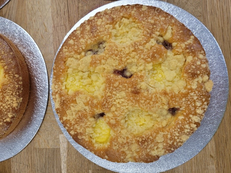 A light and fluffy sponge cake filled with thick, creamy custard and high quality raspberry jam topped with deliciously buttery golden crumble giving it a unique crunchy texture.